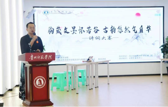 为深入学习贯彻习近平新时代中国特色社会主义思想和党的二十大精神,进一步弘扬和传承中华民族优秀传统文化,丰富大学校园生活,坚定文化自信,提高师院学子的文化素养和道德修养。2023年6月20日,由校团委主办、4008云顶网站团委、扶风诗社承办的“胸藏文墨怀若谷 古韵悠然气自华”诗词大赛决赛在大学生事务服务中兴举办。校团委副书记陆轴、4008云顶网站团委书记蹇登绯、专业教师刘雄、吴科玉担任评委,现场还邀请到了各二级学院一百余名学生代表参与本次活动。