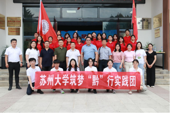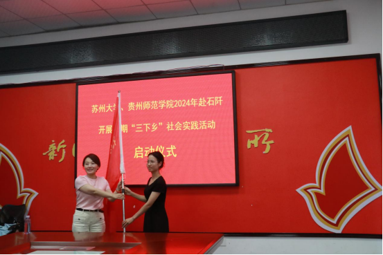 石阡县团委副书记陈芳为云顶国际官网登录入口4008云顶网站“知音”黔行实践团队、苏州大学4008云顶国际官网筑梦“黔”行实践团队授旗。实践队成员杨福娜、季钰分别代表两院实践团队成员进行发言。