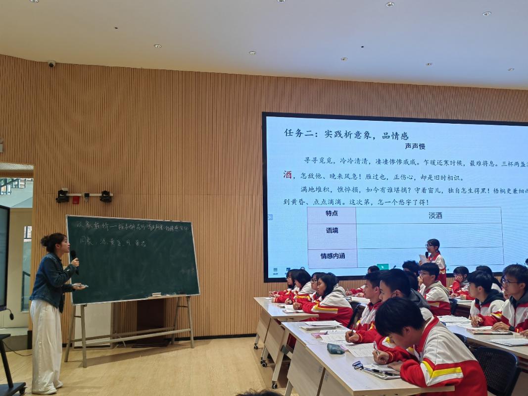 杨露老师的课堂,《以象载情——探寻<醉花阴>和<声声慢>的情感变化》,则为同学们提供了一个比较阅读的崭新视角。杨老师引导我们对比两首词中相同意象的不同运用,清晰地勾勒出李清照从闲愁、相思之愁到沉痛、绝望之愁的情感变化轨迹,令人耳目一新。