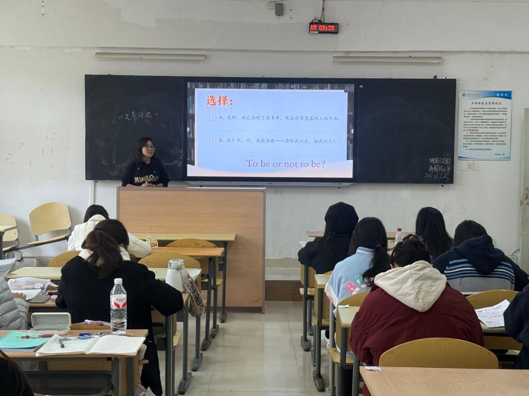 活动现场,各班以小组为单位,围绕精心准备的经典篇目进行了精彩纷呈的试讲。2024级同学作为教学“新兵”,聚焦于陶渊明的《归园田居》和普希金的《假如生活欺骗了你》等中外名篇,他们从诗歌的意象分析、情感把握入手,展现了初登讲台的青涩与活力。