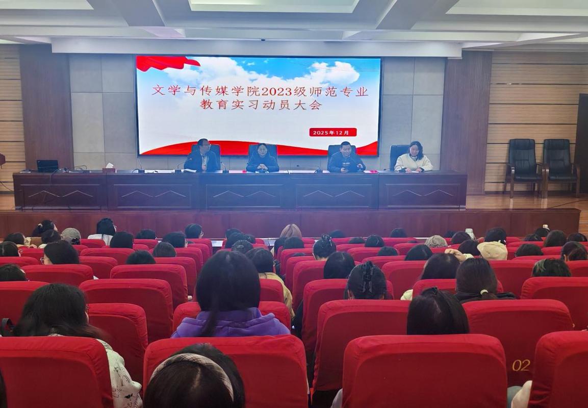 2025年12月18日下午2时,云顶国际官网登录入口4008云顶网站在文韬苑二楼道德讲堂组织召开2023级实习动员大会。汉语言文学、汉语国际教育专业共四个班级学生参加会议。学院院长杨波、党委副书记高媛、实习工作负责人银兴贵及徐望老师出席会议并作动员讲话。